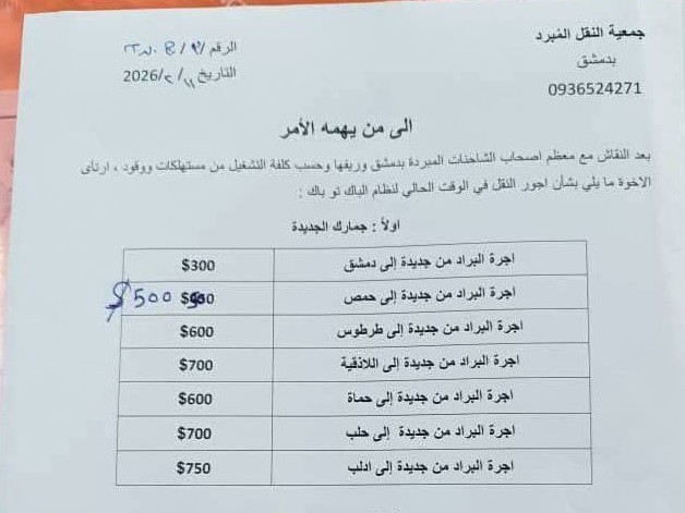 حددت جمعية النقل المبرد أجرة البرادات لجمارك جديدة وجمارك نصيب