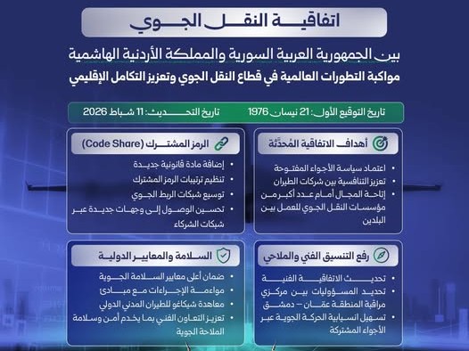 لمواكبة التطورات العالمية وتعزيز الربط الجوي.. تعرف إلى تفاصيل الاتفاقية المحدثة للنقل الجوي بين سوريا والأردن